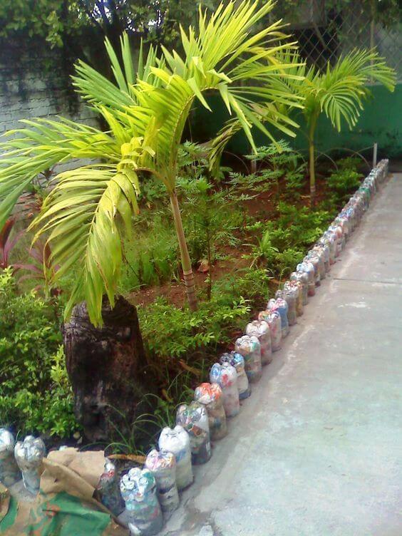 Plastic bottles can turn into colorful and functional garden borders with very little effort. Cut off the bottoms or use the full bottles, filling them with sand or soil to keep them sturdy.