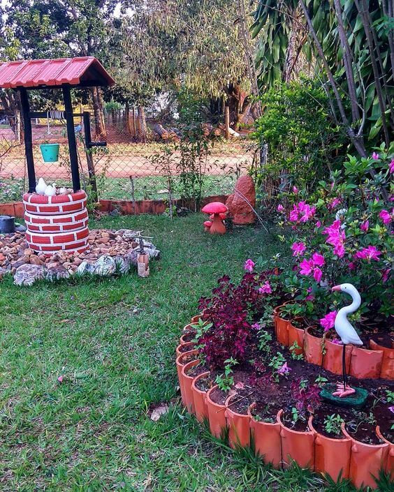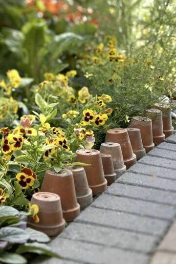 You can use whole pots too, laying them sideways for a playful edge. Make sure to press them firmly into the soil to keep them in place. This is a great way to give new life to damaged garden pots.