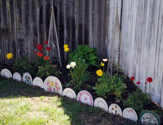 If you have chipped or mismatched plates, don’t throw them away. Instead, press them upright into the soil to form a colorful border. The patterns and colors will create a whimsical, one-of-a-kind design.