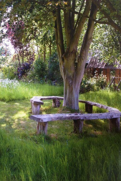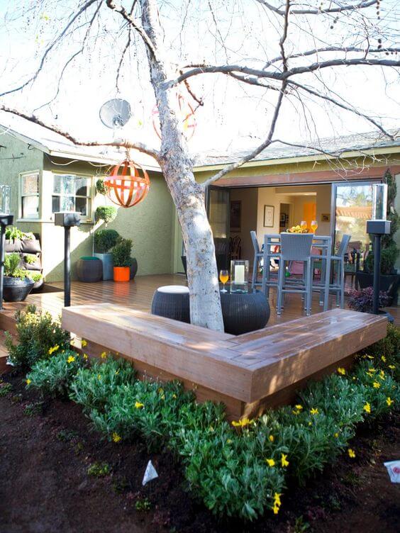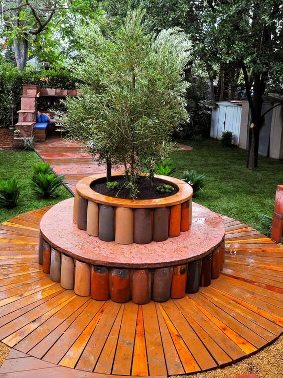 To replicate it, build a low brick wall as the foundation, leaving enough space for the tree’s roots to breathe. Attach wooden planks on top, making sure they’re treated for outdoor weather.