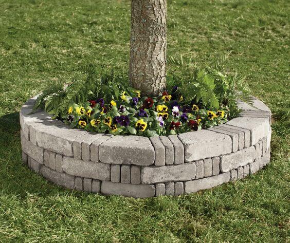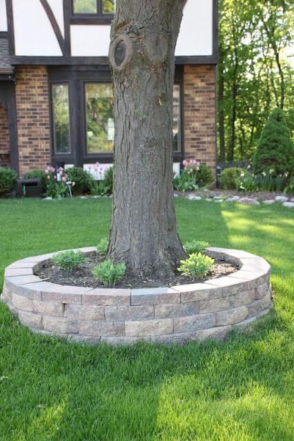 To recreate it, stack interlocking stone blocks evenly, forming a neat ring around the trunk. Fill the inner space with rich soil and plant your favorite flowers or ferns for seasonal color.