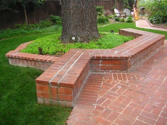 This red brick bench brings a strong architectural touch to your outdoor area while seamlessly blending with natural surroundings. The layered brickwork forms a solid and inviting structure around the tree, offering a cool place to relax on sunny days.