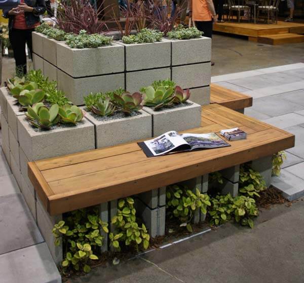 To recreate it, stack cinder blocks in your preferred shape and secure the wooden boards on top using construction adhesive or screws. Fill the gaps of the blocks with small plants or succulents for a touch of greenery.