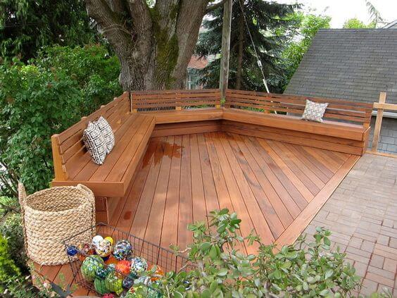 This design turns your deck into a natural retreat with built-in wooden benches that curve around a grand tree. The warm wood tones bring a cohesive look, while the open space allows the tree to shine as the centerpiece.