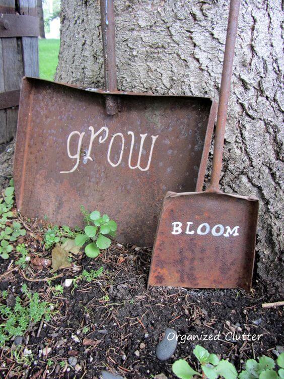 Turn an old rusty shovel into a unique garden sign. Paint your chosen words directly onto the shovel blade. Stick it upright in the ground near your pathway.