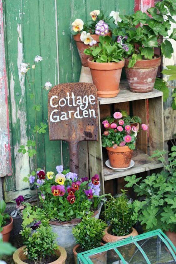 Repurpose an old shovel by painting “Cottage Garden” on the blade. Add floral designs or vines around the lettering. Stick it upright near your flower beds.