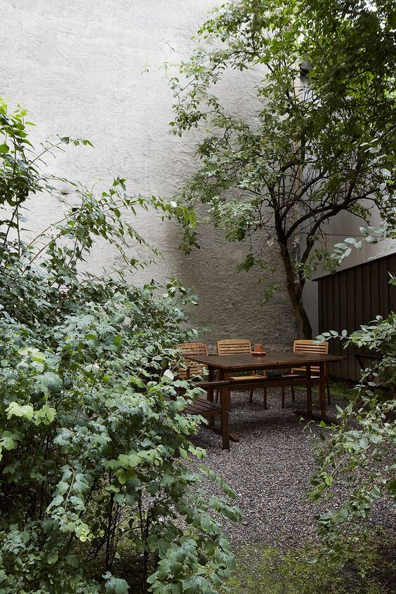 #9 An Open Space With Simple Design From Crushed Stone Ground, Furniture, Tall Wooden Wall, And Green Plants