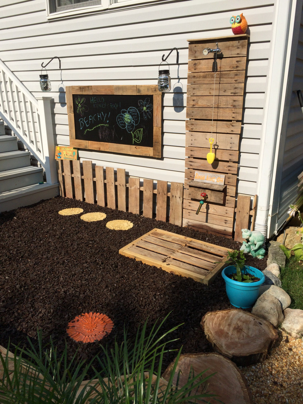 This pallet project turns a simple space into a creative outdoor play corner for kids. A chalkboard framed with pallet wood encourages drawing and writing, while the pallet water wall adds a playful element with scoops, chains, and buckets.