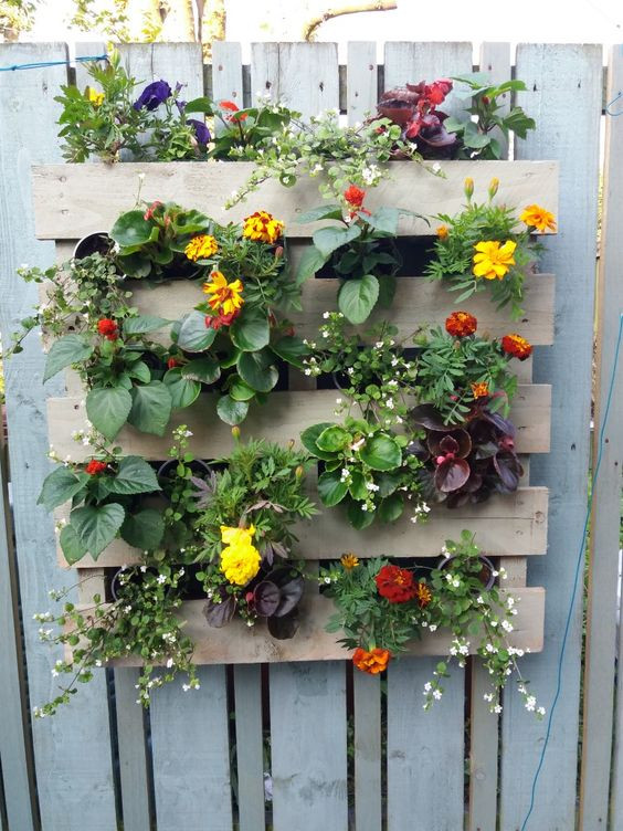 This vertical pallet wall garden turns a plain fence into a living work of art. By standing a pallet upright and filling the spaces with soil or containers, you can create multiple pockets for vibrant blooms.