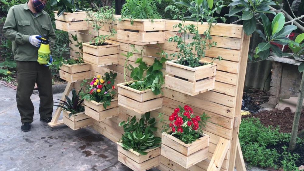 This pallet wall design transforms a simple wooden frame into a lush vertical garden with crate-style planters. Each crate is securely attached to the pallet, creating multiple planting pockets that can hold herbs, flowers, or vegetables.