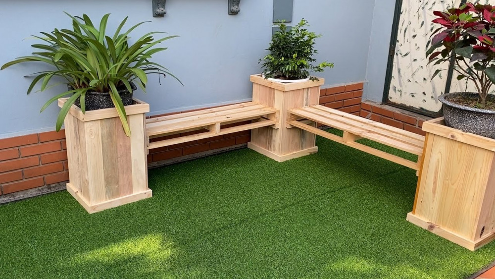 You can use durable pallet planks to build the benches and reinforce the corners with extra wood for strength. To create this, measure and cut pallets to form rectangular planter bases, then attach bench planks between them.