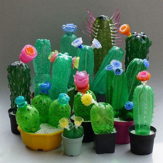 The plastic cacti can be painted and decorated to resemble real cacti, and they serve as eye-catching and sustainable additions to your indoor or outdoor decor. This imaginative project not only showcases your artistic skills but also turns plastic waste into visually appealing and easy-to-care-for faux plants.