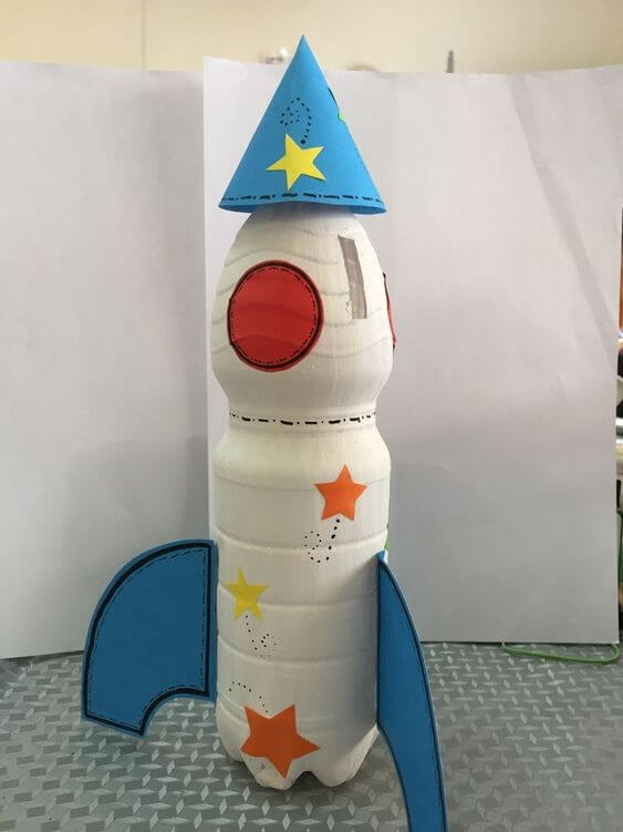 This creative lovely toy transforms a used plastic bottle into a rocket-shaped piggy bank. Children can cut and decorate the plastic bottle to resemble a rocket, complete with fins, windows, and a coin slot.