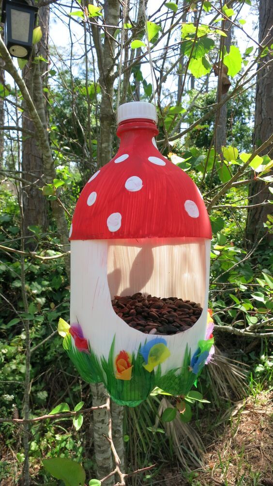 These vibrant feeding stations for birds are crafted by cutting and decorating the plastic bottle, often painting it in eye-catching colors and adding perches or feeding ports. When filled with birdseed, these feeders not only provide nourishment for local bird populations but also serve as colorful and artistic additions to your outdoor space.
