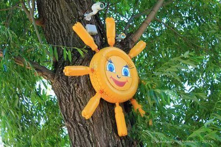 The creative sun version made from plastic bottles and an old tire, painted in a sunny yellow color, is a unique and eco-friendly DIY project. It repurposes discarded materials into a vibrant and eye-catching piece of outdoor art and brings a touch of warmth and artistry to your surroundings.
