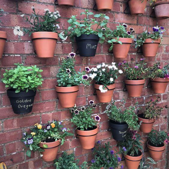 Creating a hanging pot herb garden like this is a beautifully simple and space-efficient way to grow fresh ingredients right on your patio wall. The classic combination of terracotta and black metal brackets offers a clean, rustic look that suits any outdoor space.
