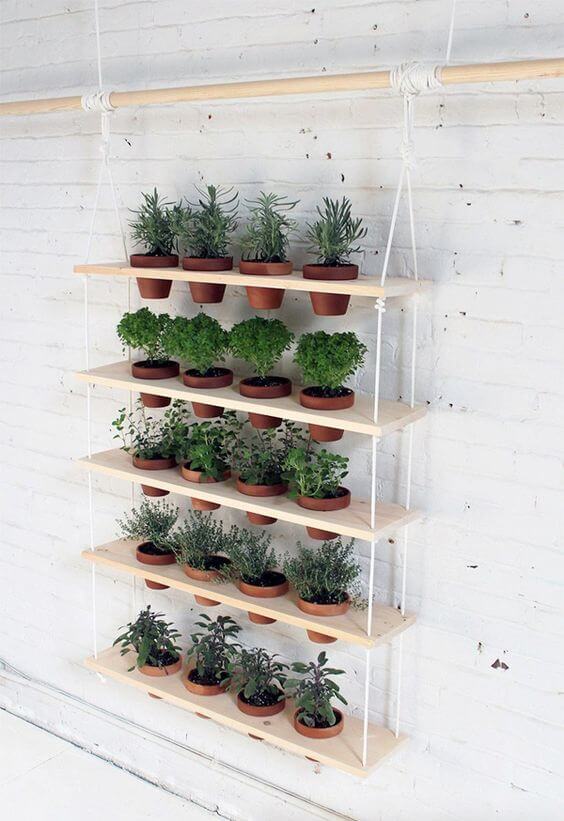 This clever hanging shelf garden uses simple materials to create a beautifully organized vertical display perfect for an urban apartment or small balcony. The light wood shelves and white rope give this planter a fresh, clean, and airy Scandinavian style.