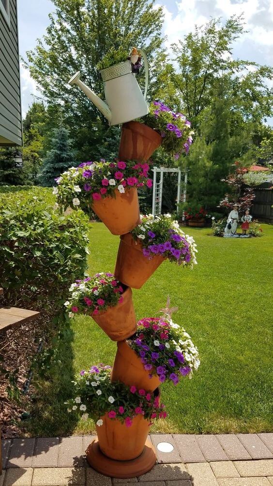The staggered and angled terra cotta pots are overflowing with bright, cascading flowers, adding a major focal point to your yard. It’s an easy, yet eye-catching, way to add vertical gardening to your outdoor space and show off beautiful blooms.