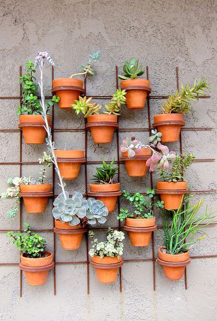 Next, use strong wire or metal clips to attach the rims of the terra cotta pots to the intersections of the grid. Plant a diverse collection of colorful succulents in the pots and watch your beautiful vertical garden thrive.