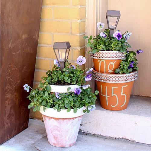 Brighten your entryway both day and night with this charming solar light and flower pot centerpiece. These tiered planters are not only a beautiful way to display colorful flowers but also a creative way to feature your house number.