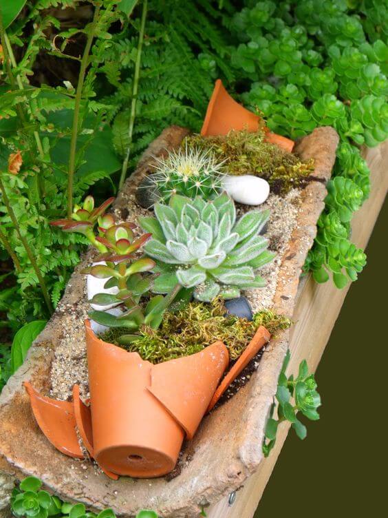 To replicate this, place a long piece of broken pot horizontally, then wedge the broken pieces of a second pot at one end. Fill the broken pot and the surrounding trough with a mix of succulent soil and sand. Arrange your plants to make them look like they are tumbling out of the broken planter.