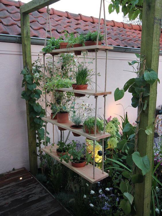 This design uses simple wood planks and thick rope to suspend multiple levels of terra cotta pots, adding depth and natural beauty to your outdoor area.