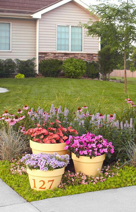 Grouping three large planters together creates a dramatic, layered display that anchors your entire garden bed. Painting your house number directly onto the bottom pot is a personalized and clever way to help guests find your home easily.
