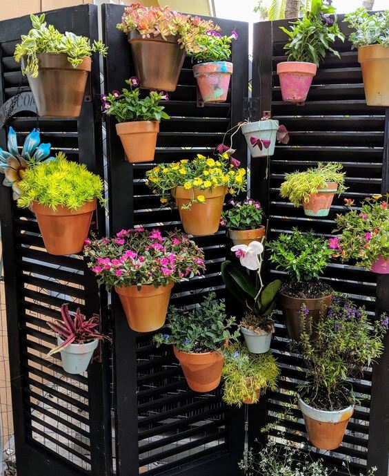 The dark, louvered background perfectly highlights the warm tones of the terra cotta pots and the vibrant green plants. This vertical display is fantastic for dividing a patio space or adding a lovely backdrop to a seating area.