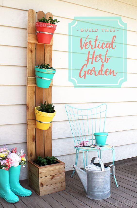 This creative vertical planter uses simple wooden fence slats to build an elevated structure that saves space beautifully. The natural wood provides a wonderful, neutral background for the vibrant colors of the painted terra cotta pots.