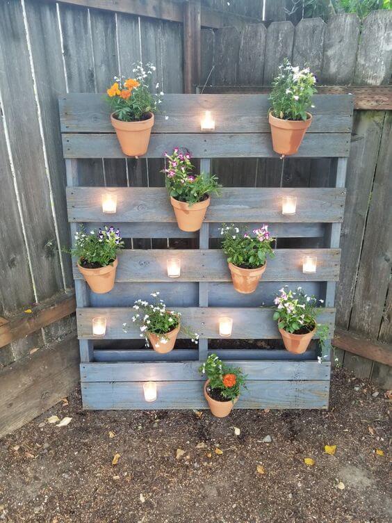 This creative design uses a vertical pallet planter combined with string lights to add a cozy, festive ambiance to your backyard at night. The soft glow of the lights woven around the pots gives your plants a magical, illuminated backdrop.