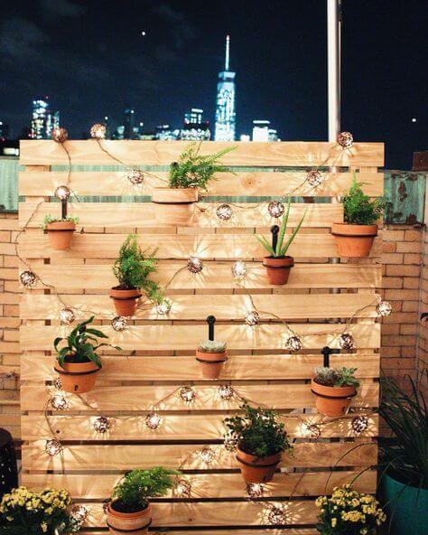 Next, attach small hooks to the slats to hold the terra cotta pots filled with various green plants and flowers. Finally, drape a string of warm LED lights horizontally across the pallet, letting them twinkle around your planters for a beautiful evening display.