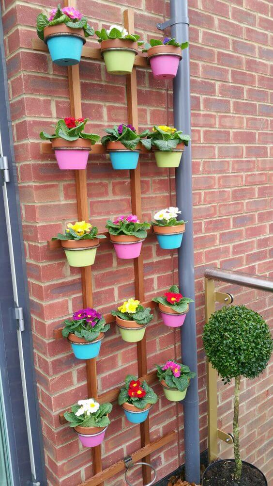 Create a bright, cheerful focal point on a drab exterior wall with this easy and appealing painted colorful vertical garden. The vibrant colors on the pots, like pink, blue, and lime green, really pop against the warm brick and simple wooden trellis.