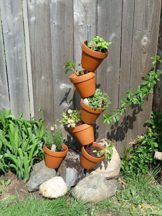 You will need to pound the rebar securely into the ground amidst your collection of decorative rocks. Then, slide the pots onto the rebar, angling them to face various directions as you fill them with soil and your favorite cooking herbs.
