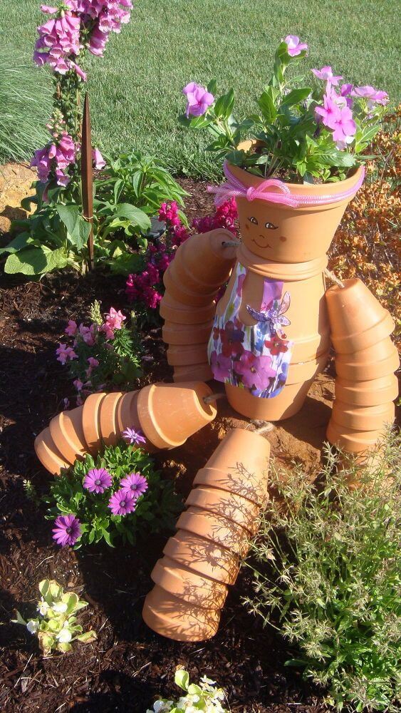 Bring a whimsical, friendly face to your garden with this wonderfully creative terra cotta pot man planter. Stacked and painted pots are cleverly assembled to form a seated figure, complete with arms and legs, adding a playful personality to your flowerbed.