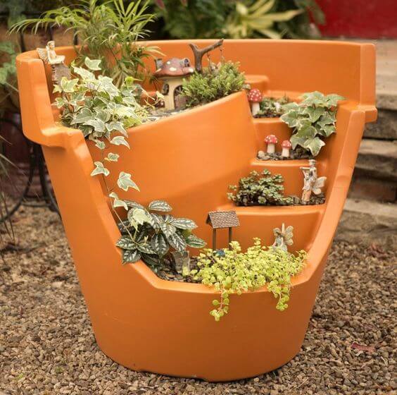 Creating a fairy garden inside a terra cotta pot is a magical project that brings whimsy and wonder to your patio or porch. This tiered design cleverly turns a large planter on its side to reveal multiple levels for miniature landscaping.