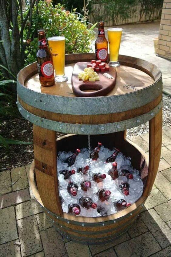 You can host summer barbecues or cozy evening gatherings without ever needing to leave your seat for refills. To create it, cut out a section of the barrel, line it with waterproof material, and add a drain plug at the bottom for easy cleanup.