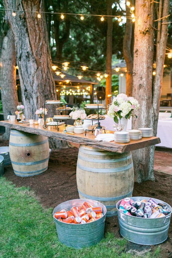 You can set a solid wooden plank across the barrels to form a stable tabletop and decorate it with flowers, lanterns, or trays. This setup works well for both casual parties and elegant evenings under string lights.
