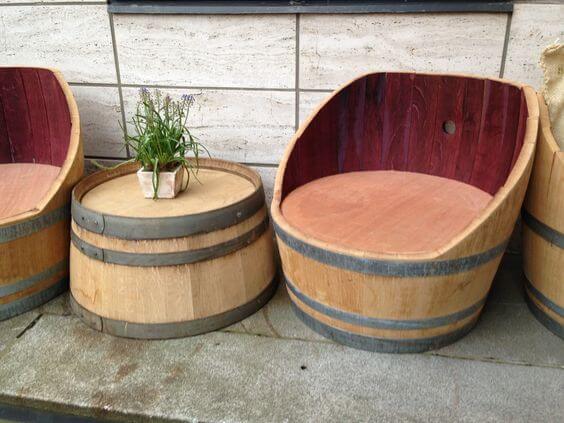 Cut each barrel carefully, smooth the edges, and attach a wooden seat panel for a polished look. The result is a charming set that blends rustic craftsmanship with functional comfort.