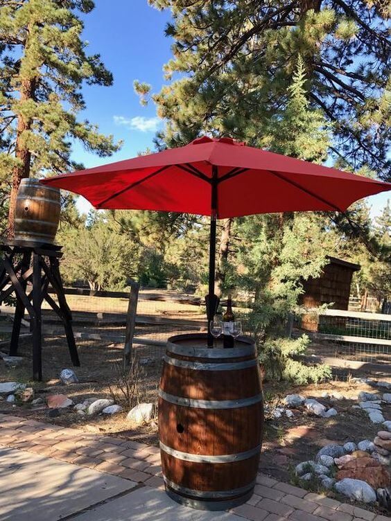 You can enjoy shade while sipping a drink, reading, or chatting with friends on a warm afternoon. To make it, drill a centered hole through the barrel’s lid for the umbrella pole and secure it with clamps inside for stability.