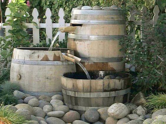 You can create it using two or three barrels stacked at different heights, allowing water to cascade beautifully between them. To build it, install a small submersible pump in the bottom barrel and connect tubing to guide the water flow.