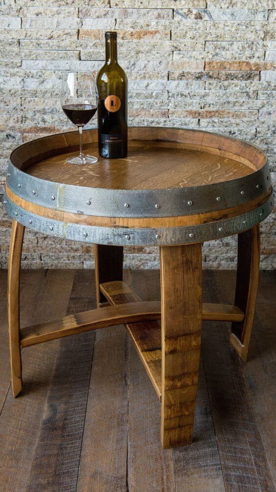 You can use it as a wine table, coffee stand, or accent piece beside a chair. To build one, cut the barrel in half, attach wooden legs, and sand everything smooth before sealing with a clear finish.