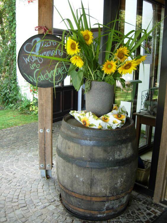 You can top the barrel with a vase, drape a floral cloth, and arrange seasonal blooms for a simple yet eye-catching setup. To prepare it, clean the barrel and give it a light coat of oil or polish to enhance the grain.