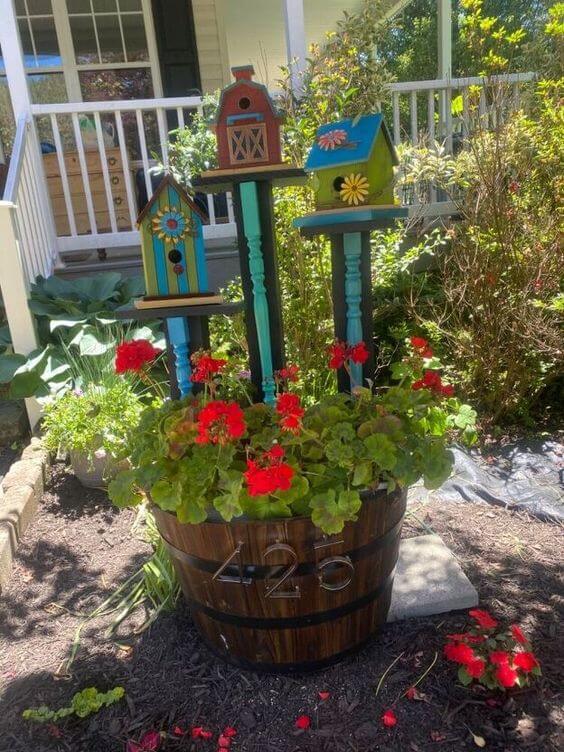 You can mount your house numbers on the front of the barrel and fill the top with blooming plants for a pop of life. To make it, add soil and vibrant flowers, then attach wooden poles to support decorative birdhouses.