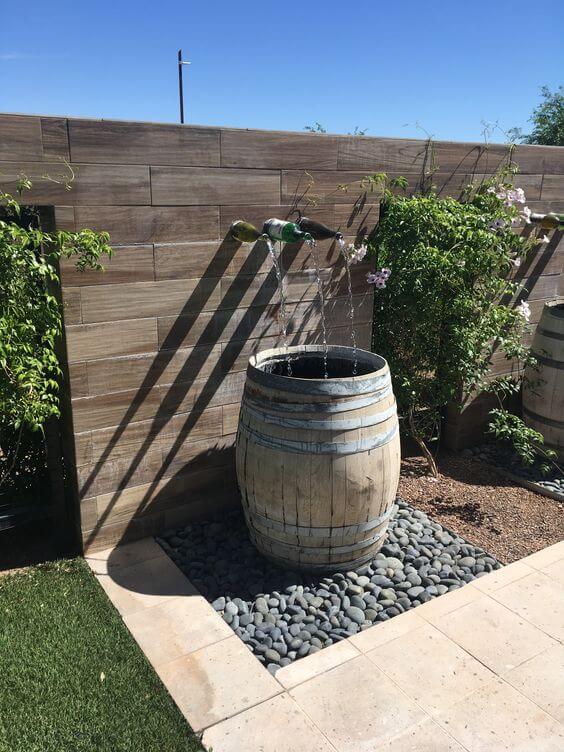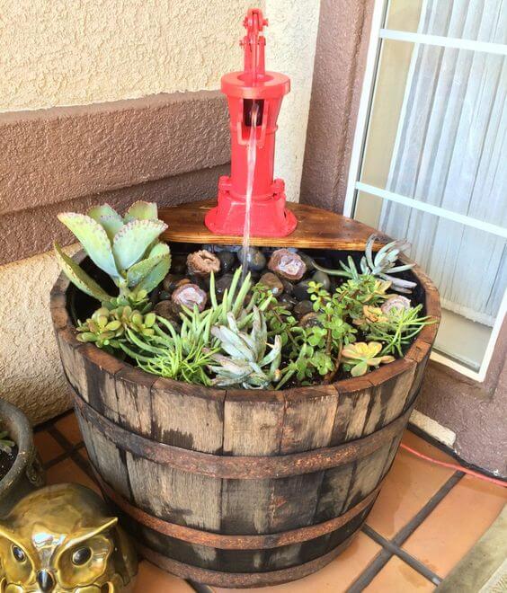 You can surround the fountain with succulents and small plants to blend texture and greenery beautifully. To make it, seal the inside of the barrel, install a small pump system, and connect it to the spout.
