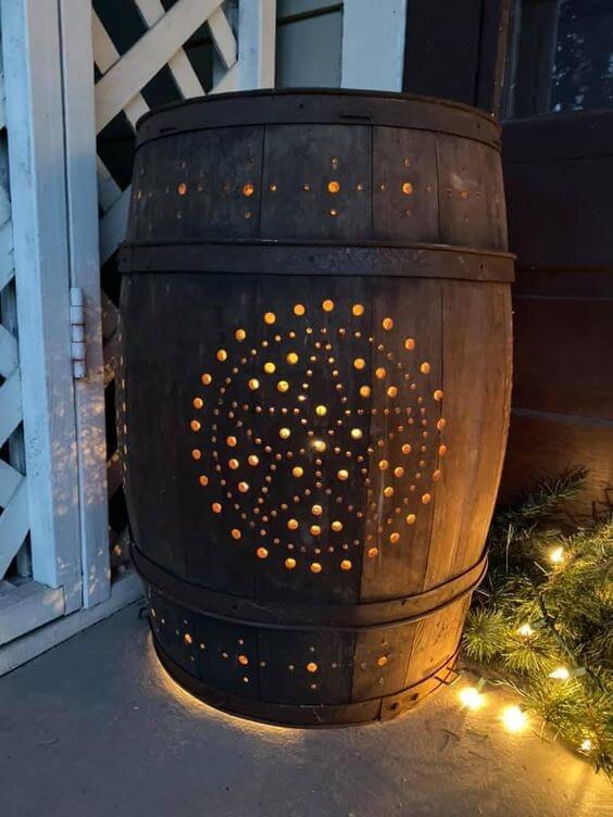 A glowing whiskey barrel adds warmth and magic to your outdoor space once the sun goes down. This project turns an old barrel into a stunning light feature with a cozy glow shining through drilled holes.