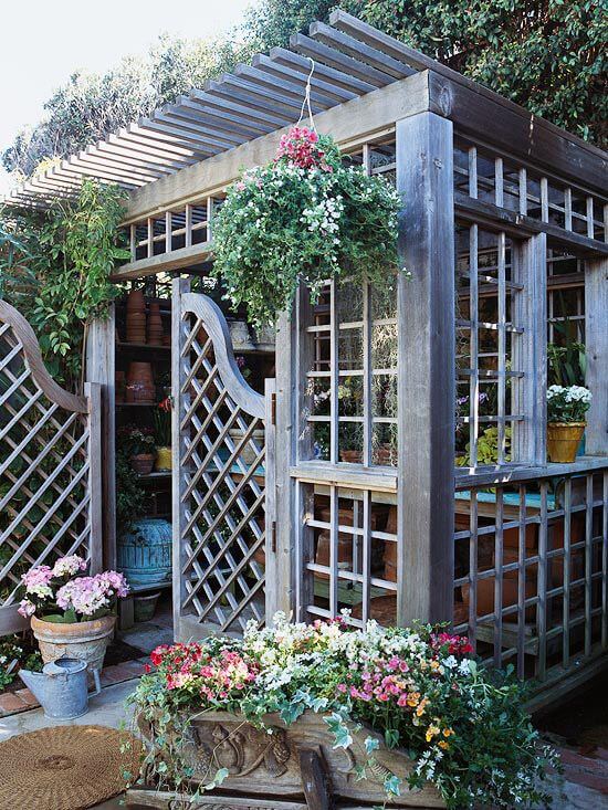 It’s perfect for storing garden tools, potted plants, or even for sipping tea while surrounded by greenery. To recreate this look, repurpose old window frames and secure them to a wooden structure for an eco-friendly build.