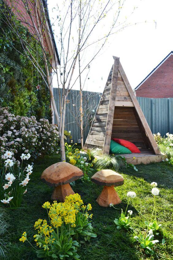 Add a small platform base to keep it dry and place a few colorful cushions inside for comfort. Surround it with flowering plants or carved wooden mushrooms to give your garden a magical woodland vibe.