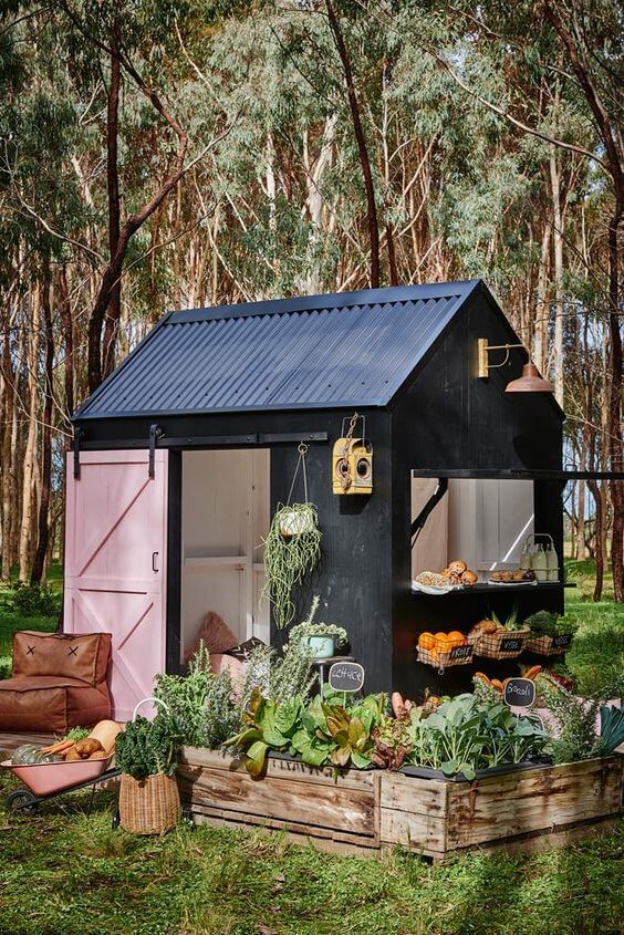 The raised garden beds filled with herbs and vegetables make it practical as well as beautiful. You can build one using plywood panels and corrugated metal for the roof to keep it durable through all seasons.
