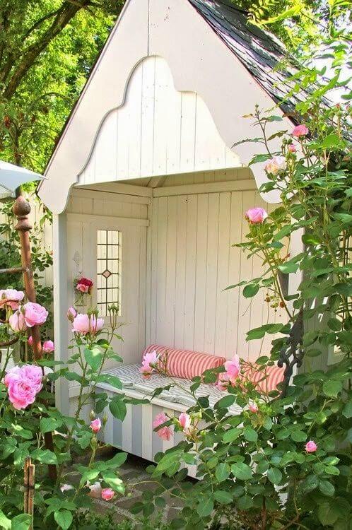 Surround the entrance with climbing roses or other fragrant vines to enhance its romantic look. Add a few throw pillows and fairy lights to turn it into your private escape for tea or reading.