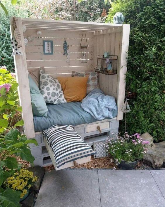The soft cushions and colorful pillows turn it into a relaxing little retreat where you can unwind surrounded by flowers. To recreate this, stack and secure wooden pallets into a frame, then add a roof panel for shelter.